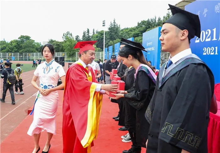 上午八点整,典礼启幕,奏唱国歌。《义勇军进行曲》庄重严肃的前奏响起,所有毕业生起立,一同唱响国歌。当最后一个音符落幕,2021届学生毕业典礼正式开始。校党委副书记李国武宣读了《关于表彰2021届西安财经大学研究生优秀毕业生和优秀学生干部的决定》《关于表彰2021届西安财经大学本科优秀毕业生和优秀学生干部的决定》。334名同学被授予校级“优秀本科毕业生”荣誉称号,136名同学被授予校级“优秀学生干部”荣誉称号。在主席台就座的各位领导为获得表彰的学生代表颁奖,校党委书记杨涛为毕业生代表赠送纪念品,声声嘱托,满满祝福。奋斗的青春,不凡的风采,他们是西财大校园中最闪耀的星;他们奋勇拼搏,全面发展,用青春书写了华丽篇章。