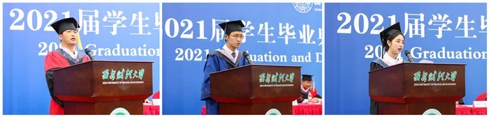 统计学院毕业生邱雨在发言中代表本科毕业生,表达了对母校的感恩和不舍之情,以及惜别恩师、奔赴新岗位,立志要报效祖国、服务社会、回馈母校的强烈愿望。时刻关注母校的变化和发展,并在优秀校友的带领和影响下,做到“博学、明理、立诚、济世”,做一个有责任、有担当、有行动、有所热爱、有所期待、有所敬畏的西财大人。