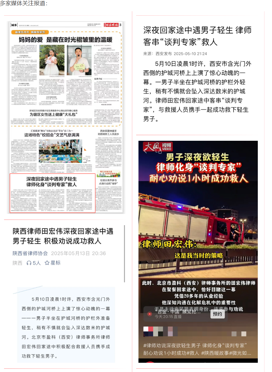 2025年5月10日凌晨,他在回家途经含光门外护城河桥时,发现一名男子正坐在护栏外欲轻生。当时现场已有公安、消防等部门人员,但该男子情绪极不稳定,氛围特别紧张。田宏伟律师主动请缨,利用自己作为律师的专业沟通技巧,耐心劝导一个多小时,最终成功说服男子放弃轻生念头,化解了一场危机。回忆起当时的情景,田宏伟表示:“那名男子情绪极不稳定,稍微受到刺激就可能发生意外。”他充分发挥律师的沟通优势,用温和而坚定的语气倾听对方诉说,给予理解和共情。“有什么困难我们一起想办法,没有过不去的坎,活着最重要。”在劝说过程中,田宏伟律师不停这样安慰轻生男子。一个多小时后,男子的情绪逐渐平复。令人感动的是,成功救援后,田宏伟不仅婉拒了对方用三轮车送他回家的好意,得知男子生活困难后还给了他200元生活费解决他的生活困难,并叮嘱他好好生活。