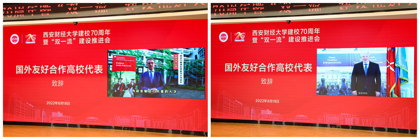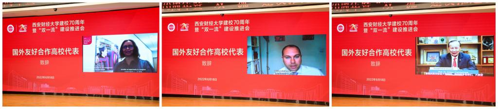 国家统计局副局长毛有丰、中国高等教育学会高等财经教育分会理事长施建军及国外友好院校德国财经与管理应用技术大学校长柏恩特·海茨、俄罗斯圣彼得堡国立经济大学校长伊戈尔·阿纳托利耶维奇·马克西姆采夫、泰国格乐大学校长杨金泉、英国切斯特大学国际事务主任乔纳森·普理查德、英国南威尔士大学国际发展与合作中心主任丽萨·戴维斯通过视频方式向学校表达祝福。