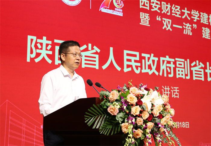 陕西省副省长方光华代表陕西省人民政府向西安财经大学全体师生员工和广大校友表示热烈祝贺,向长期以来关心支持陕西高等教育事业发展的社会各界朋友表示衷心感谢。他指出,西安财经大学是陕西唯一一所财经类高校,建校70年来,学校始终坚持社会主义办学方向,扎根三秦大地,培育造就了一大批财经类专业人才,为陕西省和国家经济社会建设提供了有力的人才和智力支持。党的十八大以来,学校坚持内涵发展、综合改革、条件建设“三大攻坚行动”,办学条件明显改善,学科建设水平大幅提升,人才培养质量显著提高,师资队伍结构逐步优化,服务社会经济发展能力日益显著,各项事业取得了长足发展。