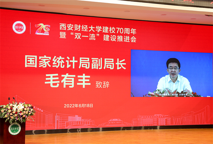 国家统计局副局长毛有丰在视频致辞中代表国家统计局向西安财经大学全体师生员工和广大校友表示热烈祝贺,向长期以来关心支持统计工作的陕西省委、省政府表示衷心感谢。他指出,西安财经大学是一所办学历史悠久、治学经验丰富、具有鲜明特色的财经类高等学府。70年来,学校为全国统计系统输送了数以万计的统计专业人才,为推动统计事业发展提供了强有力的人才智力支持。特别是自2010年陕西省人民政府和国家统计局共建西安财经大学以来,学校充分发挥共建优势,在统计人才培养、统计科学研究等方面取得了积极的成效。他希望学校进一步突出办学特色,充分发挥统计学科优势,加强统计科学基础研究和创新,积极推进“双一流”建设,为统计事业改革发展提供源源不断的新生力量,为全面建设社会主义现代化国家培养更多高素质专业化人才。他表示国家统计局也将一如既往地关心、支持西安财经大学建设和发展,与陕西省人民政府一道,共同推动学校建设特色鲜明高水平财经大学步伐。