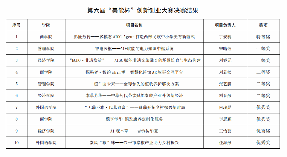 4月8日下午,第六届“美能杯”创新创业大赛决赛在长安校区大学生活动中心举行。副校长白红武,杰出校友陕西美能清洁能源有限责任公司董事长晏立群及美能能源集团、陕西省民革企业家联谊会有关代表,学校相关职能部门负责人、各学院参赛队伍、师生代表参加大赛。经过激烈角逐,本次比赛评选出特等奖1名,一等奖2名,二等奖3名,优秀奖4名。