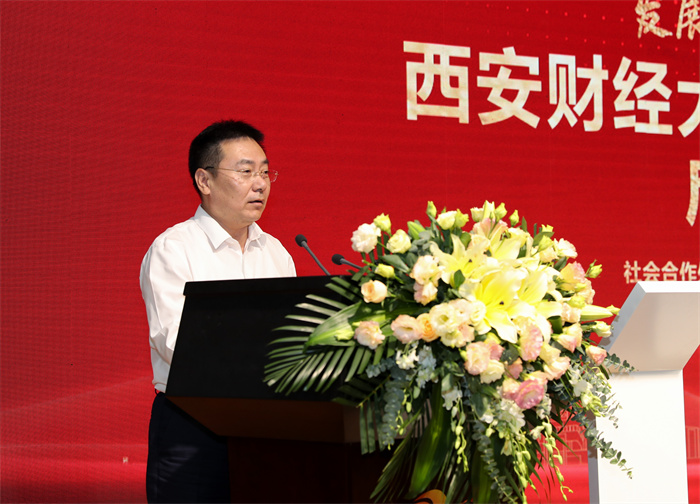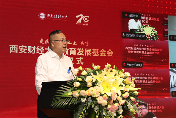 党委书记杨涛在讲话中对参加会议的各位领导嘉宾、校友代表、老师和同学们表示衷心的感谢。七十年来,西安财经大学艰苦奋斗、自强不息,扎根西部、薪火相传,一步一步的发展壮大离不开广大校友的深深厚爱和无数爱心人士的孜孜关心。今后,学校将不断建立完善校院两级校友工作机制体系,与教育发展基金会开展更深入的良性互动,坚持校友总会、教育发展基金会并驾齐驱、共同发力,为支持学校高质量完成“十四五”期间各项任务,建设特色鲜明高水平财经大学作出更大贡献。