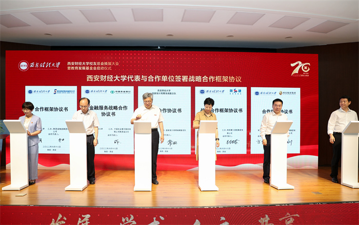 国家统计局青海调查总队副总队长常丽娟校友、中国农业银行股份有限公司陕西省分行副行长、西安分会行长薛雷、陕西建工控股集团有限公司党委副书记、总经理毛继东校友,西安旅游集团有限责任公司董事长毋文利校友与我校签署合作框架协议,助力我校教育教学事业高质量发展。校长方明代表我校与合作单位签约。