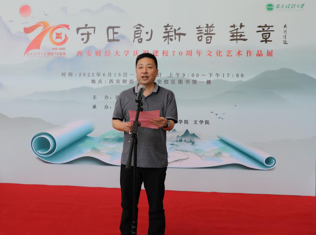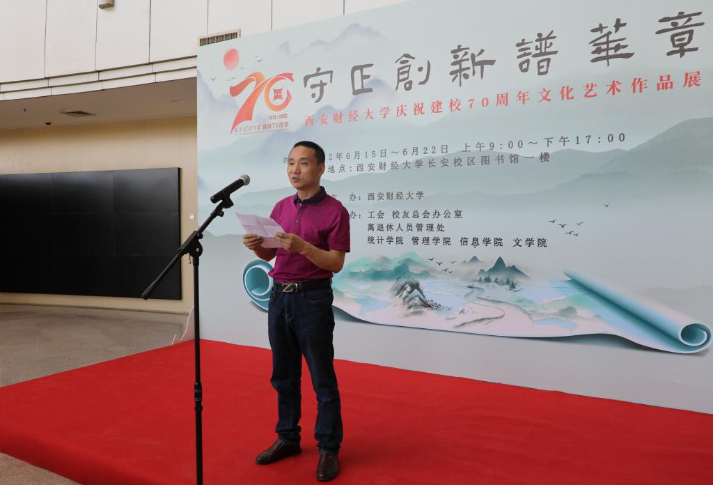 丹青歌盛世,翰墨颂华章。6月15日上午,守正创新谱华章——庆祝西安财经大学建校70周年文化艺术作品展在我校长安校区图书馆一楼大厅开幕。陕西省教科文卫体工会主席徐富权,校党委书记杨涛,校长方明,校党委副书记薛博,陕西高校书法界代表,部分兄弟高校同仁,校友代表,学校相关职能部门负责人和校内书法爱好者70余人参加开幕式并观展。校党委副书记薛博主持开幕式。