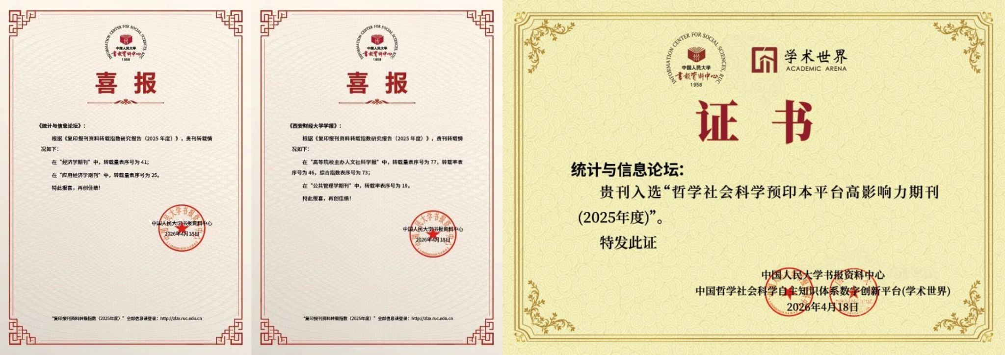 4月18日,由中国人民大学书报资料中心、中国哲学社会科学自主知识体系数字创新平台(学术世界)主办的“2026年中国人民大学复印报刊资料转载指数发布暨‘人工智能+哲学社会科学研究’论坛”在中国人民大学举行。论坛发布了《复印报刊资料转载指数研究报告(2025年度)》和《哲学社会科学预印本平台高影响力论文、期刊评价研究报告(2025年度)》,我校“两刊”双双入选人大复印报刊资料重要转载来源期刊。